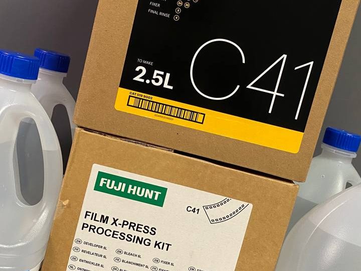 Para revelar los carretes en color utilizamos química C41 Kodak o Fujifilm.